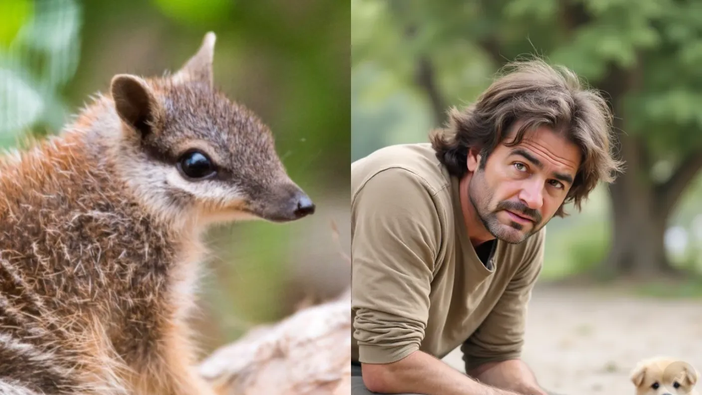By the way, a pet-to-human AI generator says if a numbat (on the left, below) were a man, he’d look like this, the picture on the right:
